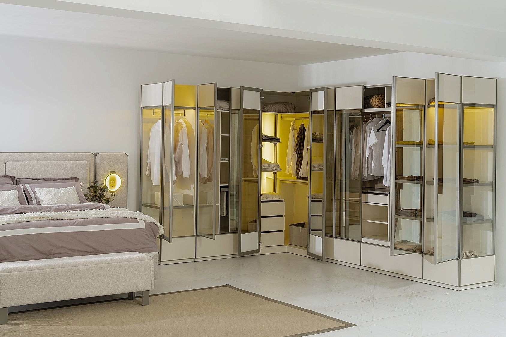 - Dolabımız modül parçalardan oluşmaktadır. İstenildiğinde 4 kapaklı veya 5 kapaklı köşe modül dolap dan istediğiniz kadar ilave yaparak odanıza göre tasarlayabilirsiniz.