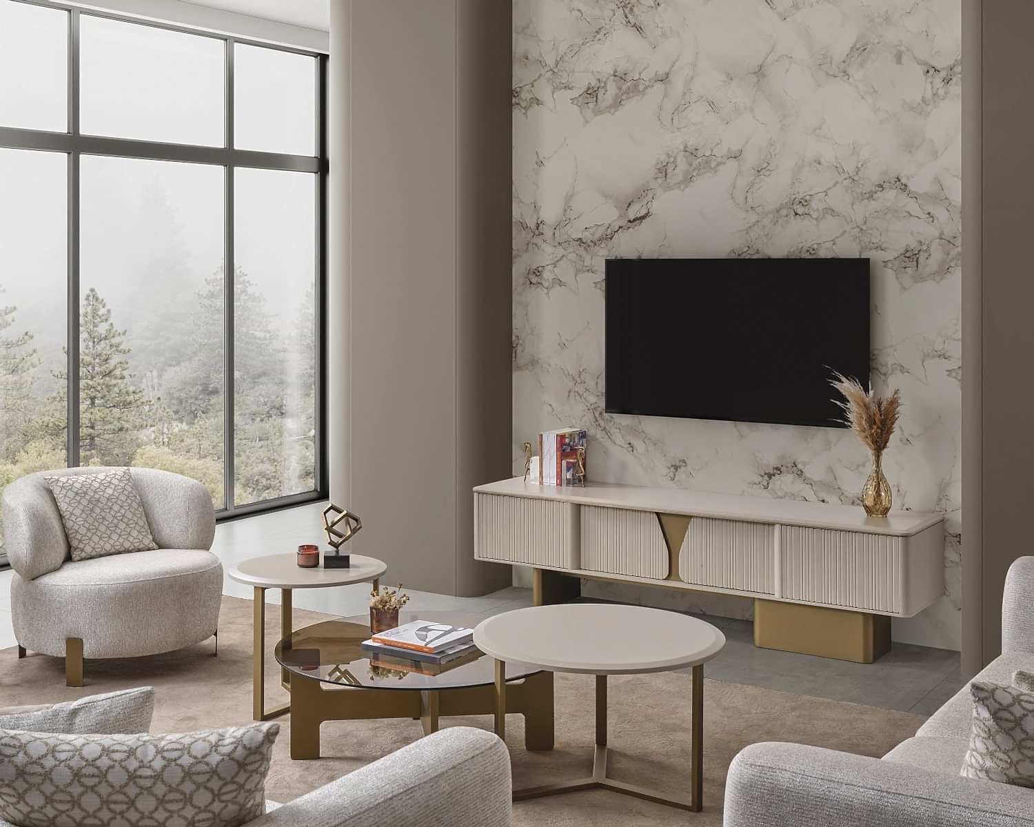 Lavına Koltuk Takımı, modern tasarımı ve yüksek konforu ile salon dekorasyonuna şık ve zarif bir dokunuş sağlar.