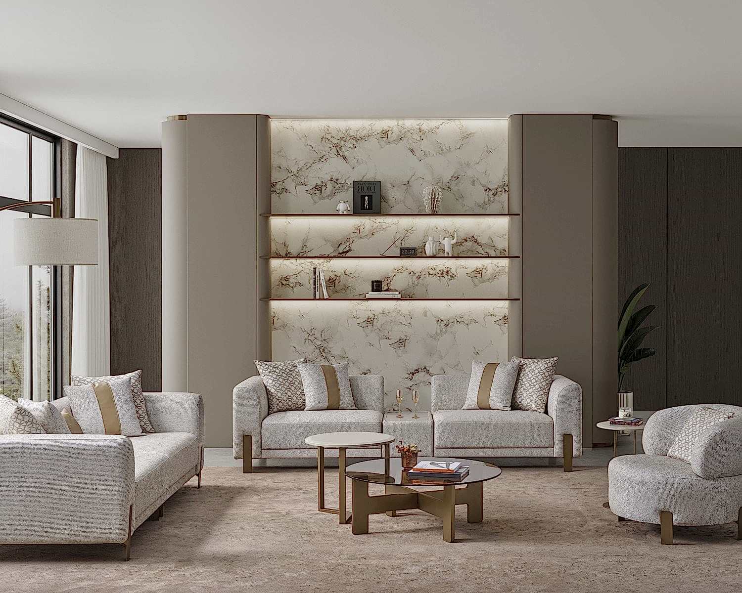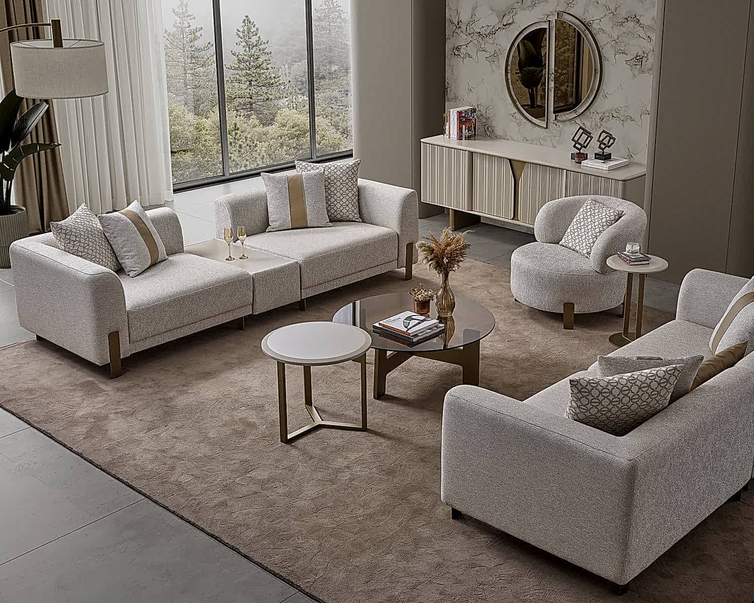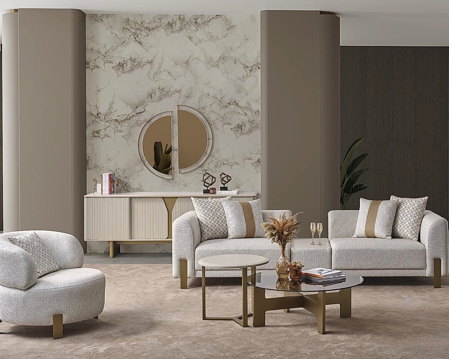 Estetik detayları ve yüksek konforu bir araya getiren Hermes Koltuk Takımı, salon dekorasyonunda lüks bir atmosfer oluşturur.