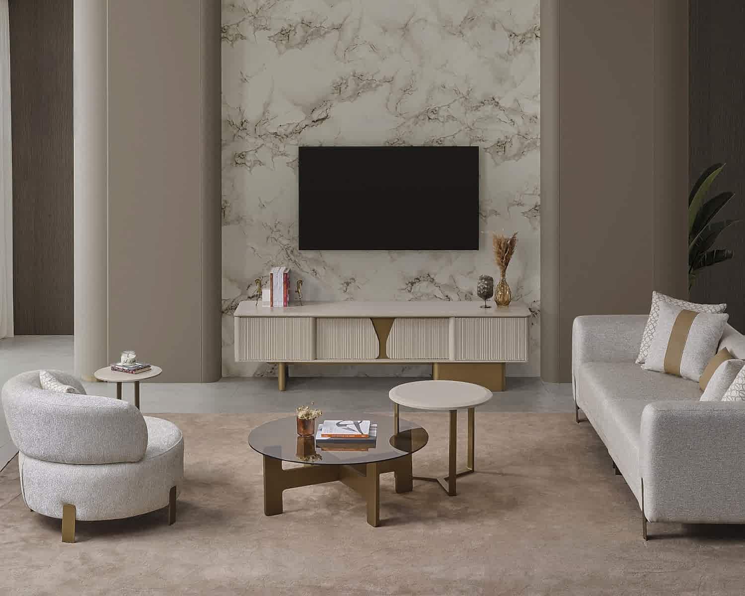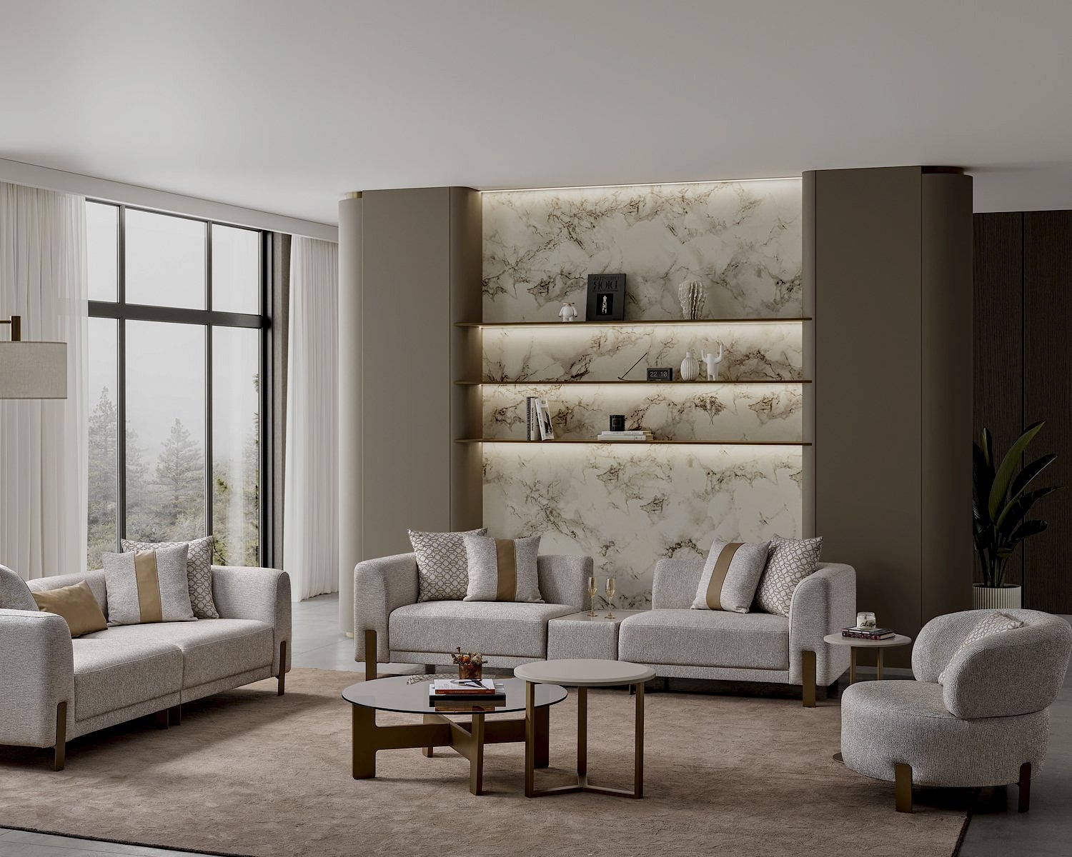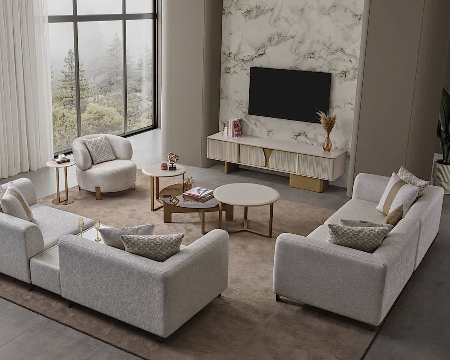 Estetik detayları ve yüksek konforu bir araya getiren Hermes Koltuk Takımı, salon dekorasyonunda lüks bir atmosfer oluşturur.